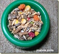 OUTROS: semente de girassol, outros tipos de sementes como alpiste, amendoim, nozes, milho, queijo, peixinho seco, ovo cozido ou mexido sem tempero, carne devidamente cozida, ervilha, semente de abóbora, rações (gatos, cachorros e pássaros), sorgo, passas.